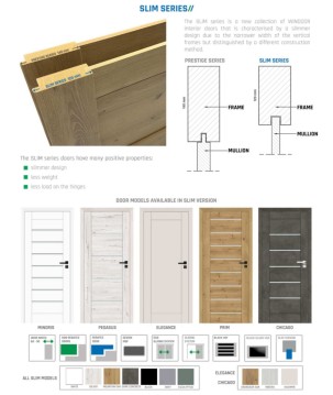 De SLIM-serie is een nieuwe collectie binnendeuren die zich kenmerkt door een slanker uiterlijk door de smallere breedte van de verticale kozijnen, maar vooral door een lager gewicht en daardoor een lagere belasting van de scharnieren.